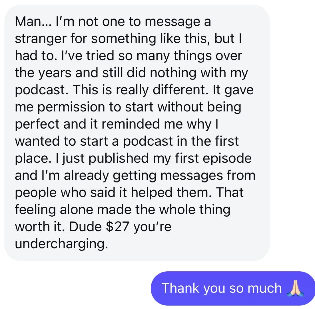 "$27 usually buys me lunch but this gave me a full podcast strategy. I was shocked at how fast I could move once I stopped second guessing and just followed it."