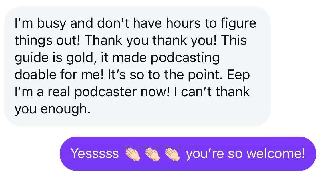 "I kept saying I’d start a podcast ‘next month’… for like 8 months. This guide gave me the exact roadmap I needed. It was straight to the point, I didn't get overwhelmed. I recorded my trailer in 3 days and launched with 3 episodes the next week. Total game changer!"