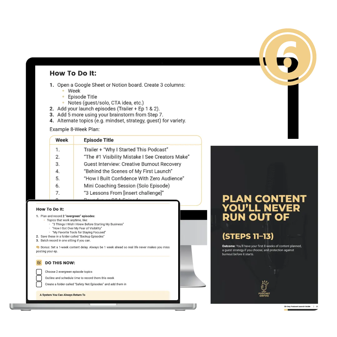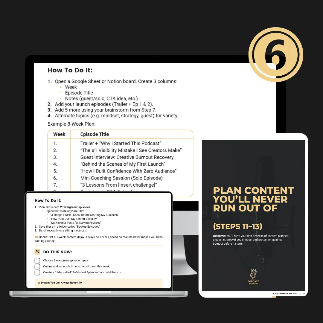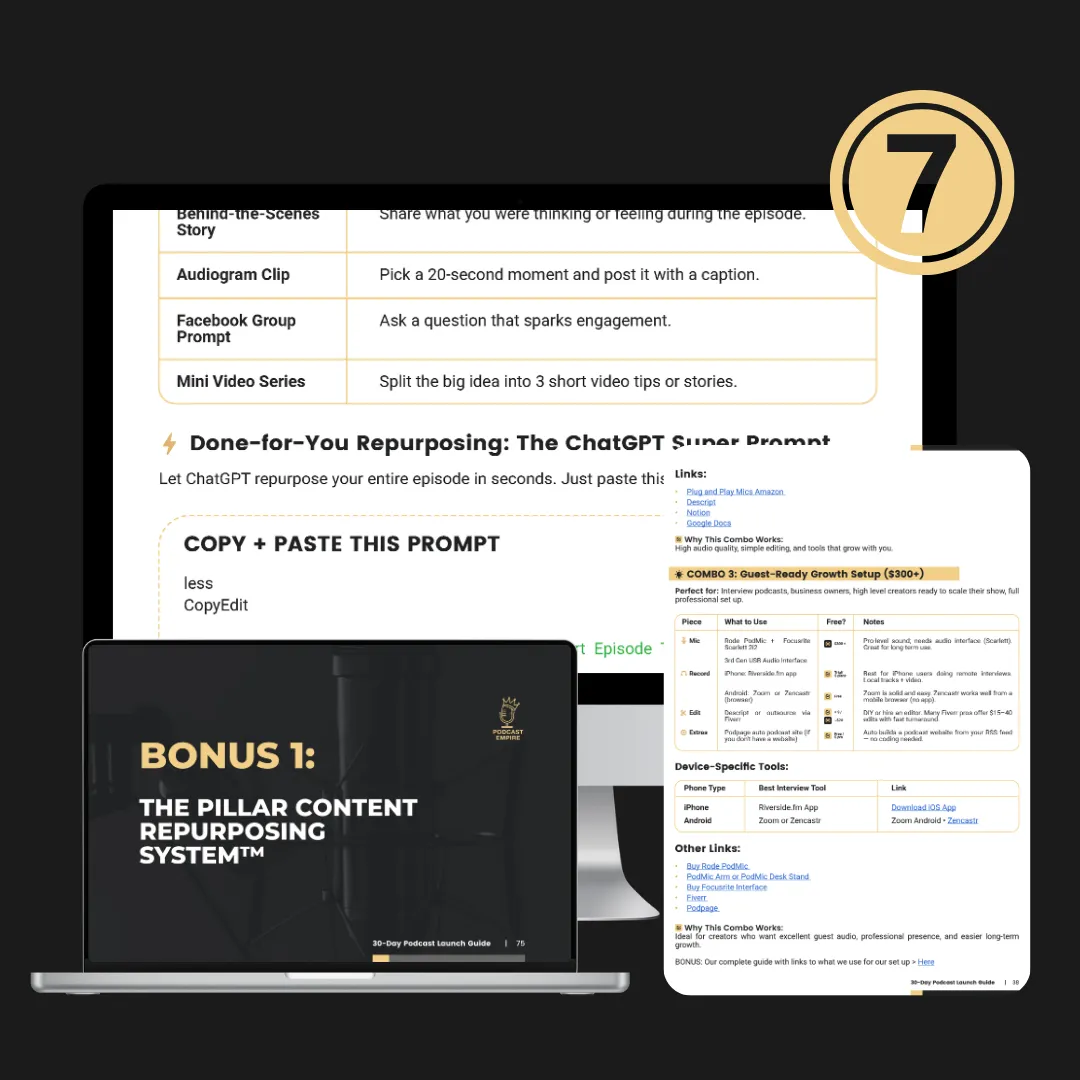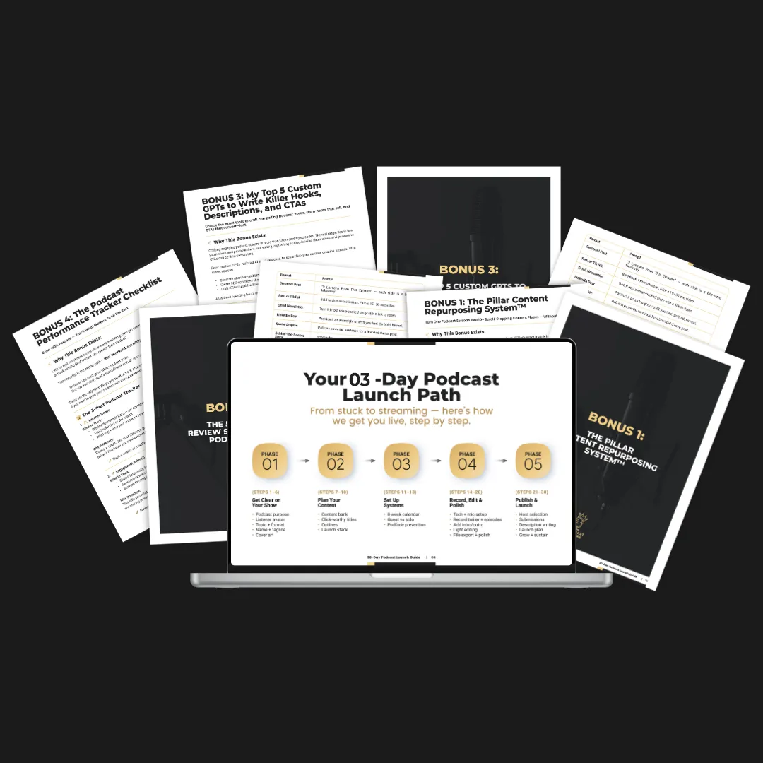 It’s everything you need to go from idea to live show, with clarity, speed, and confidence.The GPT Prompt Vault Launch Checklist, Episode Tracker, Gear & Tech Setup Guide, Promo Scripts & Caption Templates, Review Strategy Kit, Repurposing System.