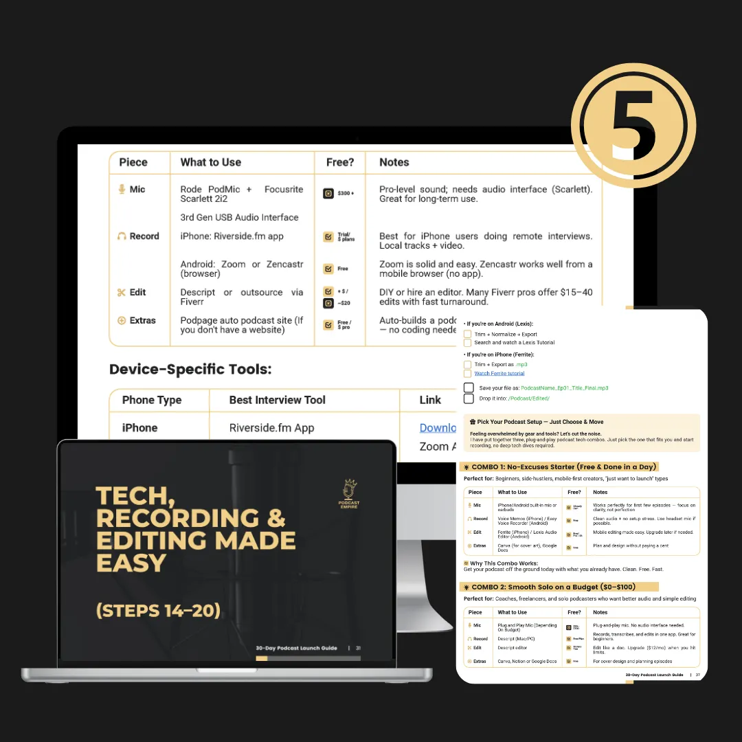 Bonus: Beginner tech kit (Free – Pro options) + Step-by-step recording checklist + Royalty-free music resources + intro/outro templates